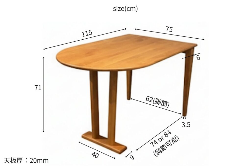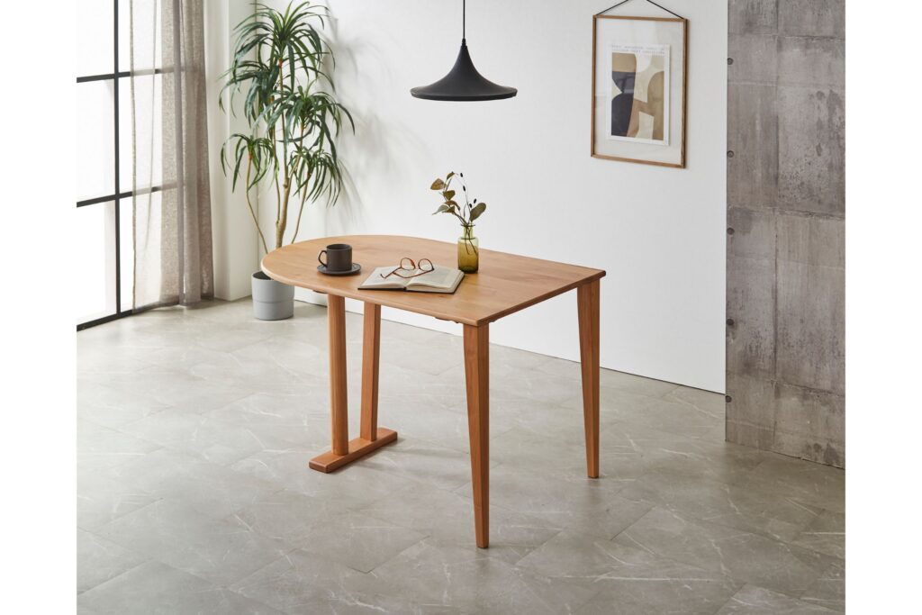 天板の直線部を壁付けすることで、限られたスペースを最大限生かせるテーブルです