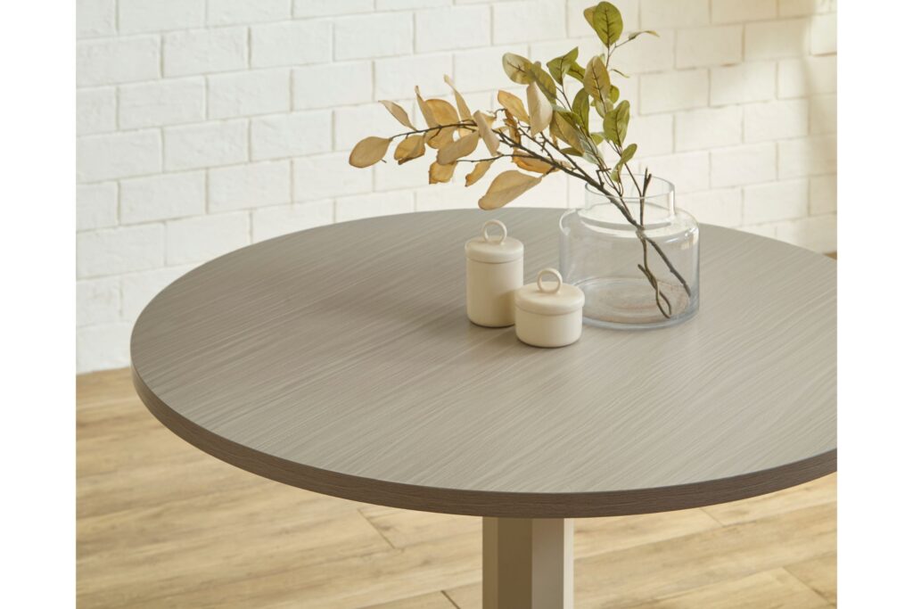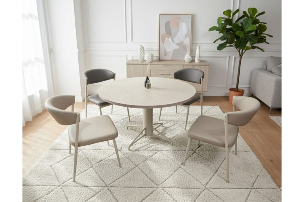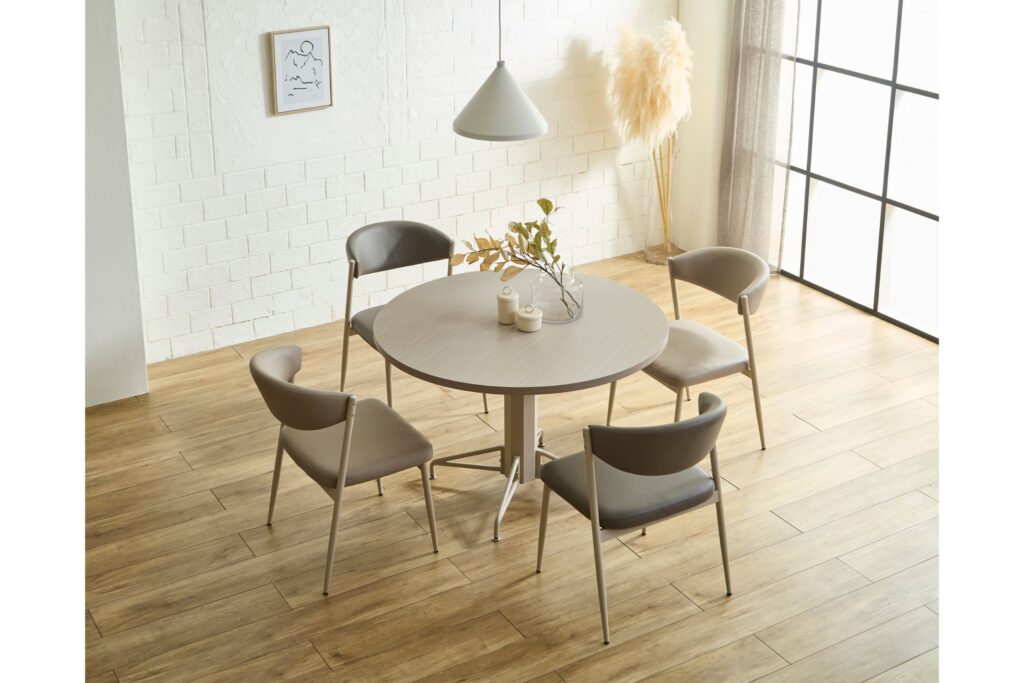 淡い木目調の円形テーブルと、アースカラーのチェアが空間を優しく彩ります